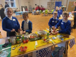 Schools buddied up in pairs to produce a range of different foods from England, Greece, Italy, Romania and Pakistan. Scones, Greek Salad, Pizza, Salam de Biscuit and Samosas were all on the menu.